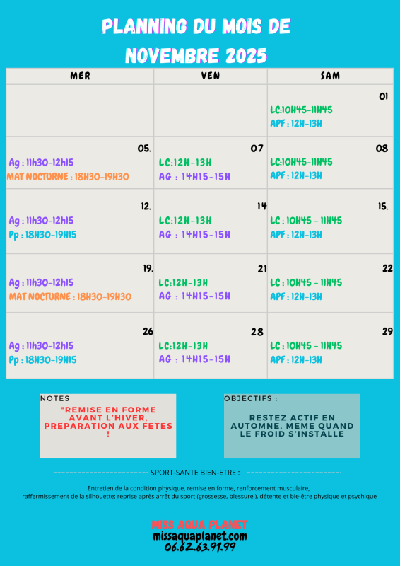 *Planning de NOVEMBRE 2025, sera disponible sur le site de réservation à partir de mi-OCTOBRE 2025