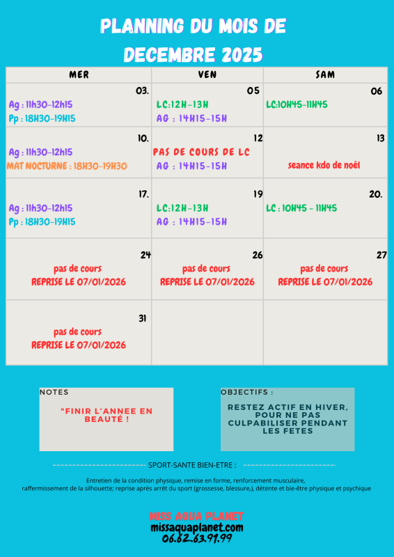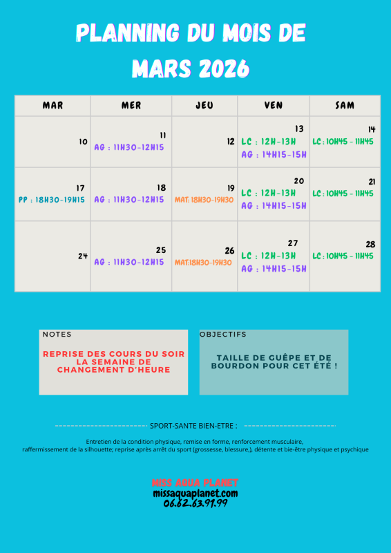 - AG : AquaGym en piscine : Les séances varient une semaine sur 2, entre des séances douce, tonic et muscu, accessible à tous (les mercredis hors vacances scolaires).