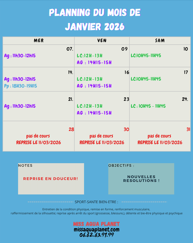 *Planning de JANVIER 2026, sera disponible sur le site de réservation à partir de mi-DECEMBRE 2025