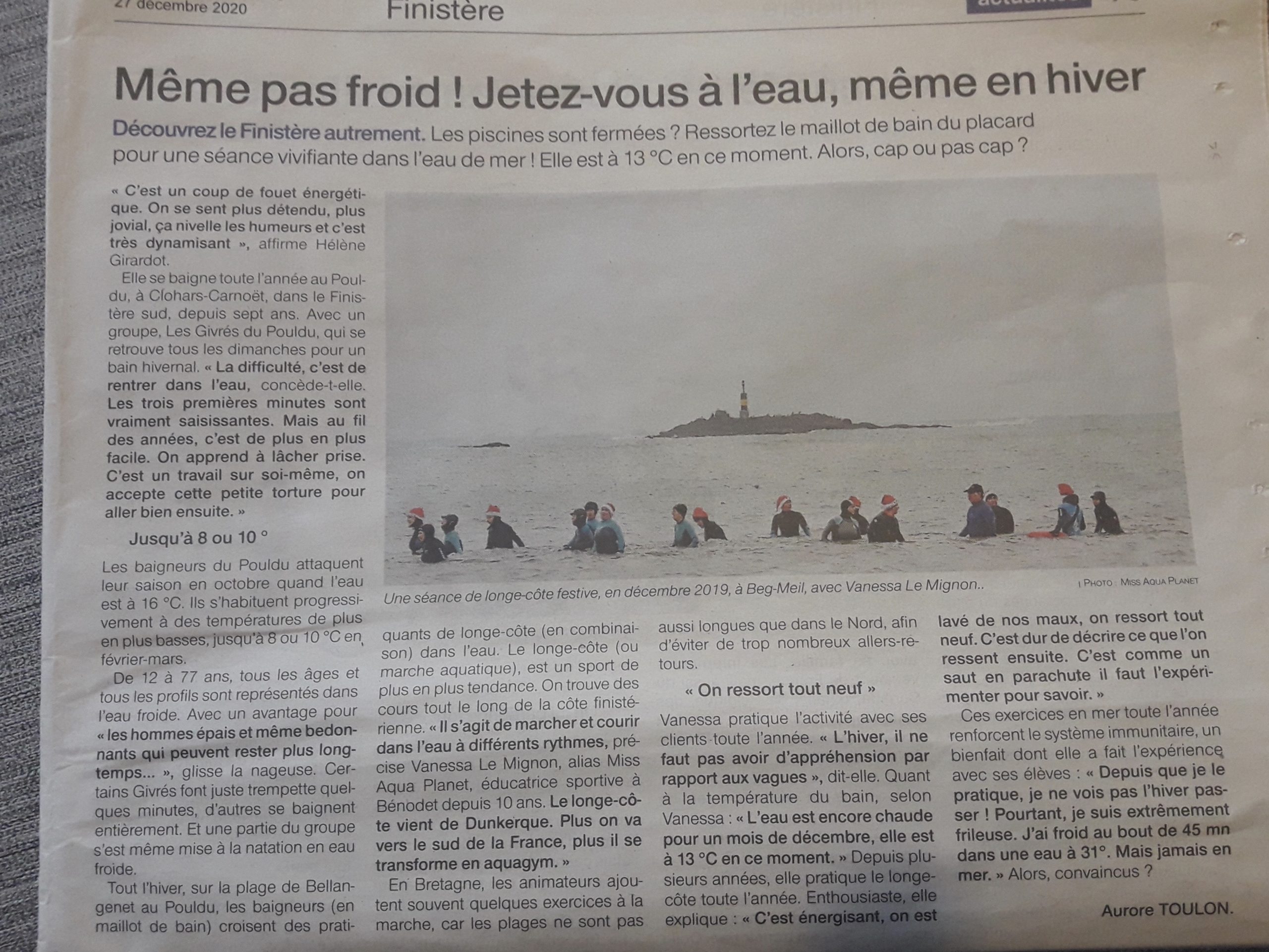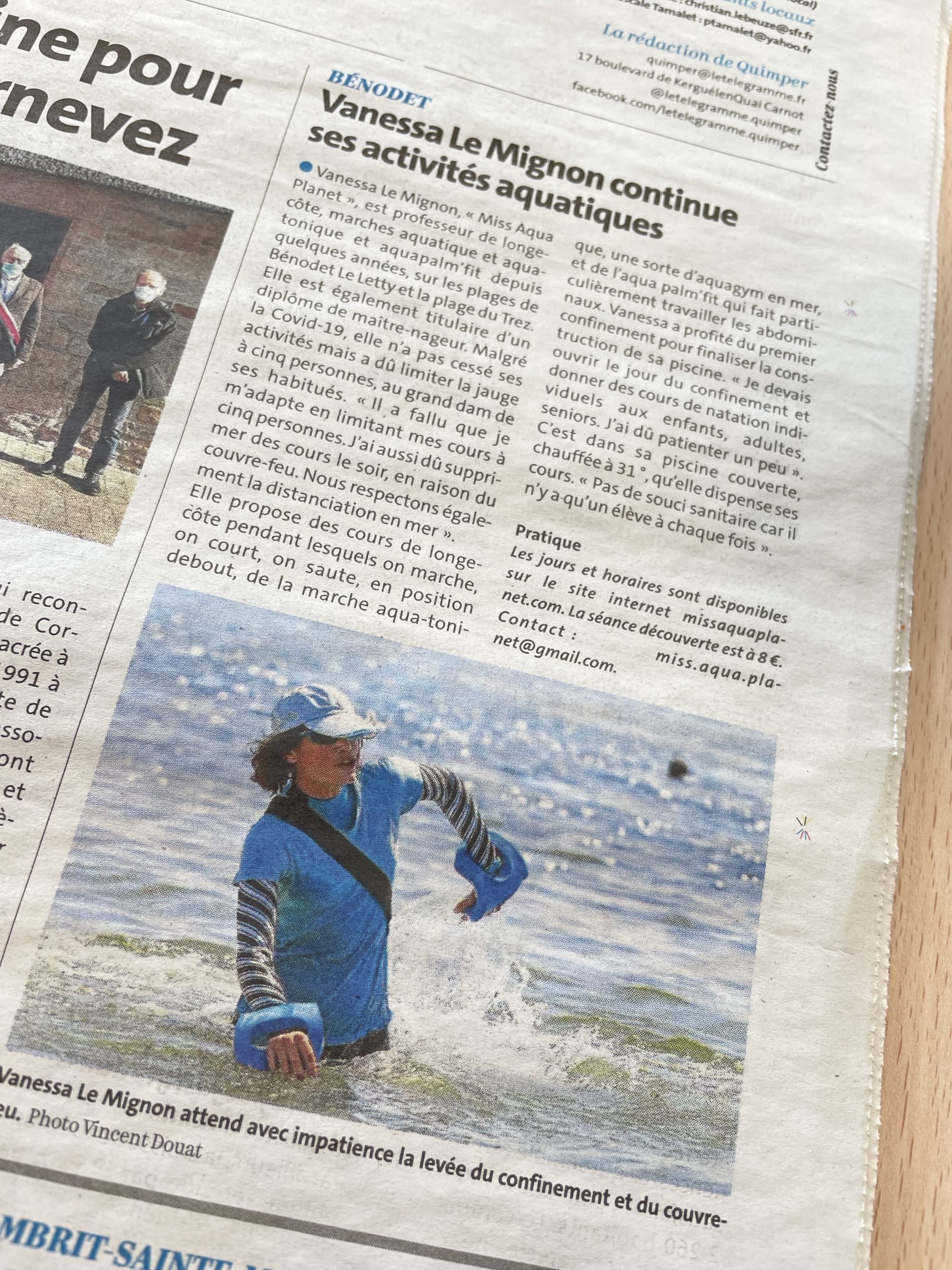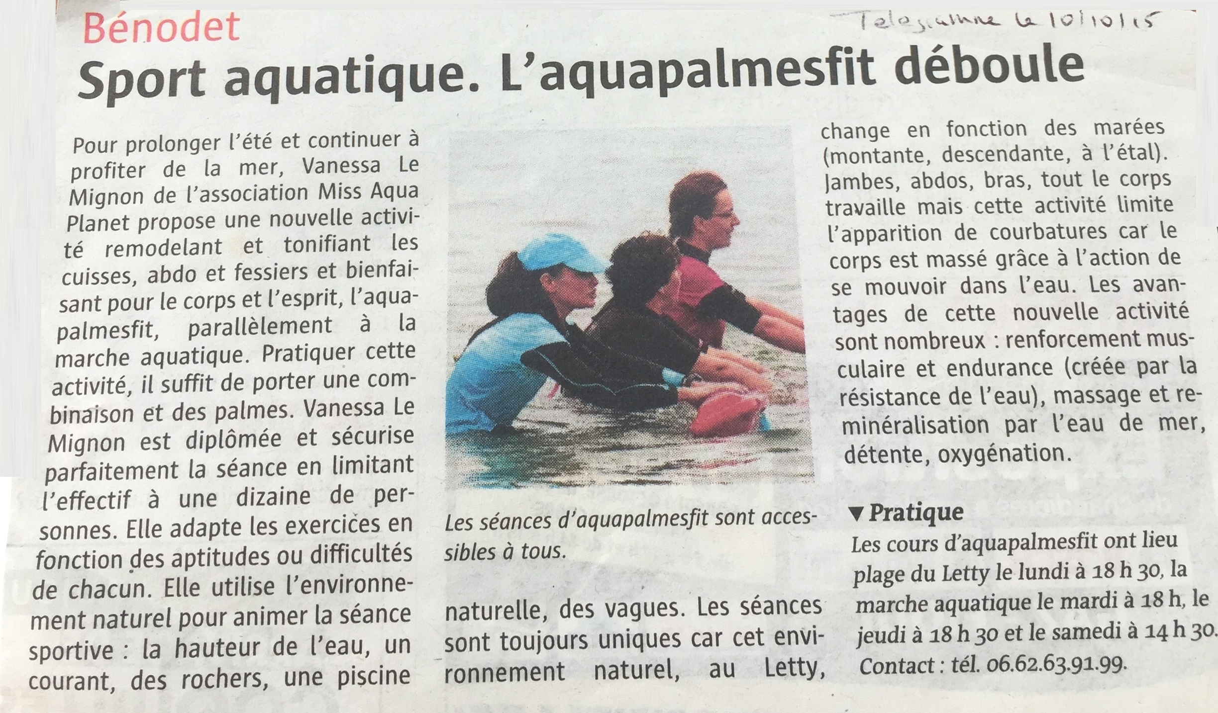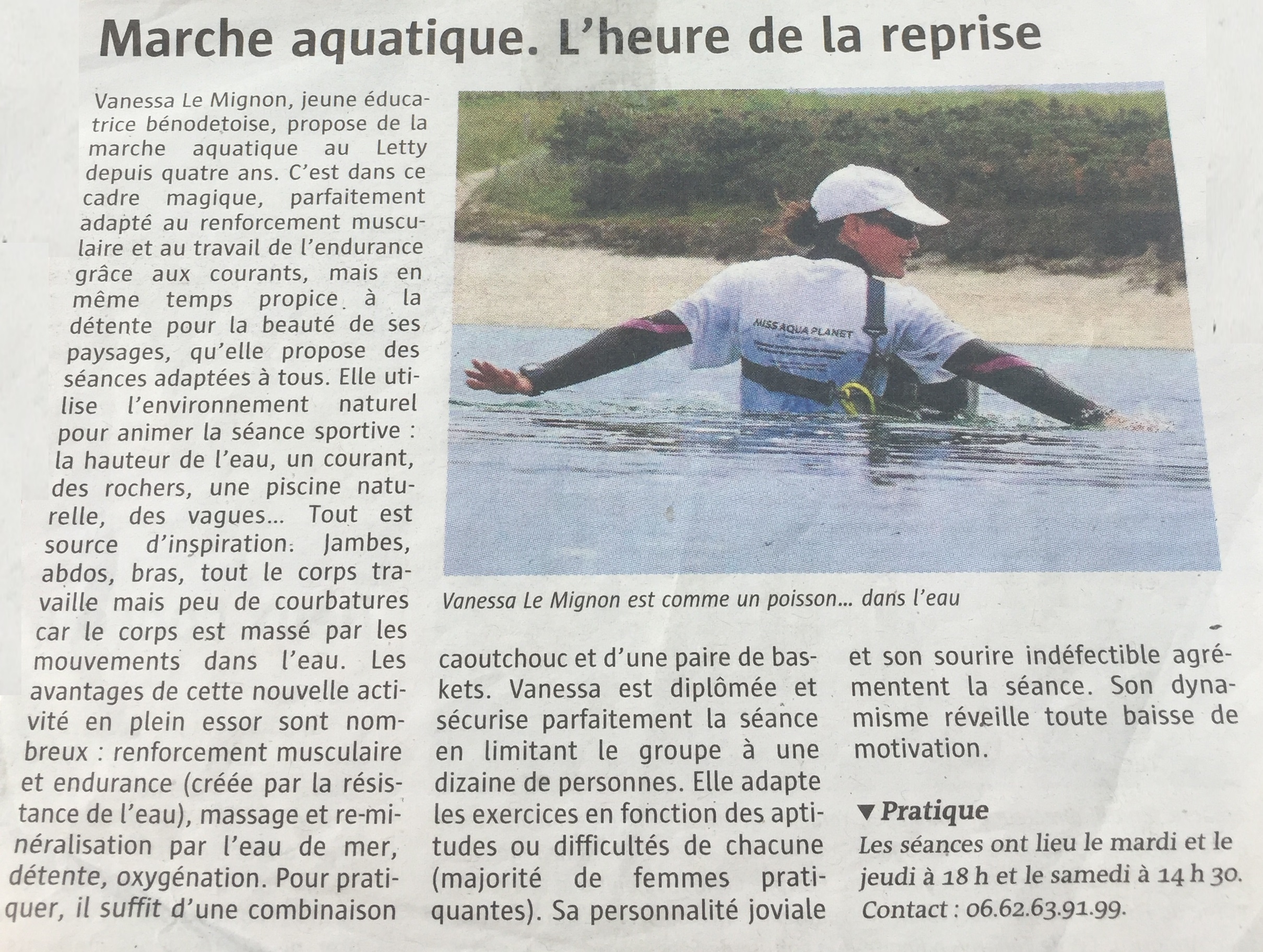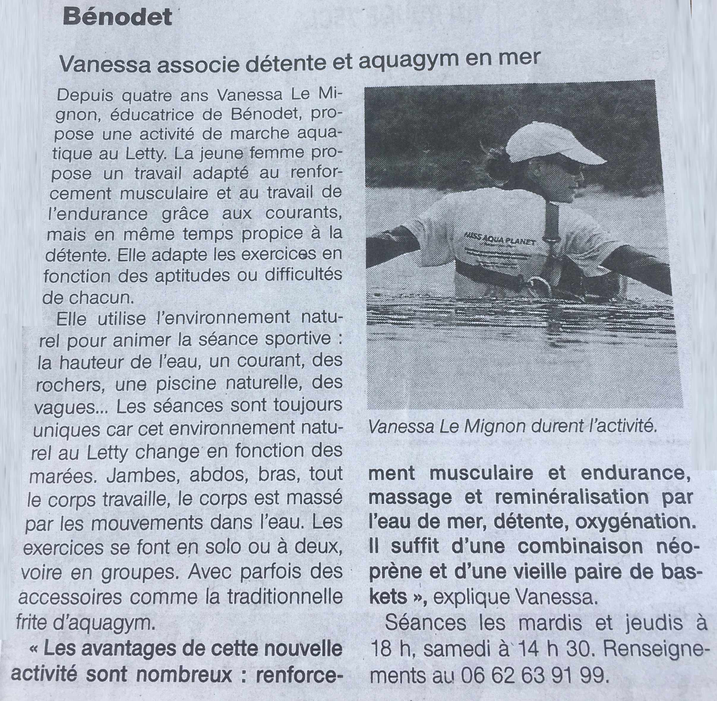 Vanessa Le Mignon, Miss Aqua Planet, professe le longe-côte, la marche aquatique et l’aquapalm’fit, depuis quelques années, sur les plages de Bénodet. Cette jeune sportive est également titulaire d’un diplôme de maître-nageur. Il y a quelques mois, elle a eu l’idée de construire une piscine couverte à son domicile, chauffée à 31 °C et mesurant 8 m sur 5, avec une profondeur d’1 m 30, dans l’optique de proposer des cours de natation pour enfants, adultes et seniors. C’est elle-même qui a construit la piscine.